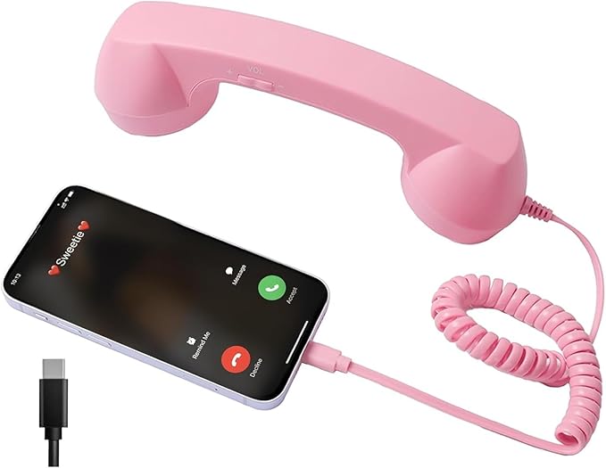 Parishop スマホ 受話器 iPhone iPad 用 携帯電話用ヘッドセットコンピューター 首に挟める アイフォン アンドロイド レトロ 電話機 Type-C対応 プラグ 対応 有線電話 反放射線機能 便利 (ピンク)
