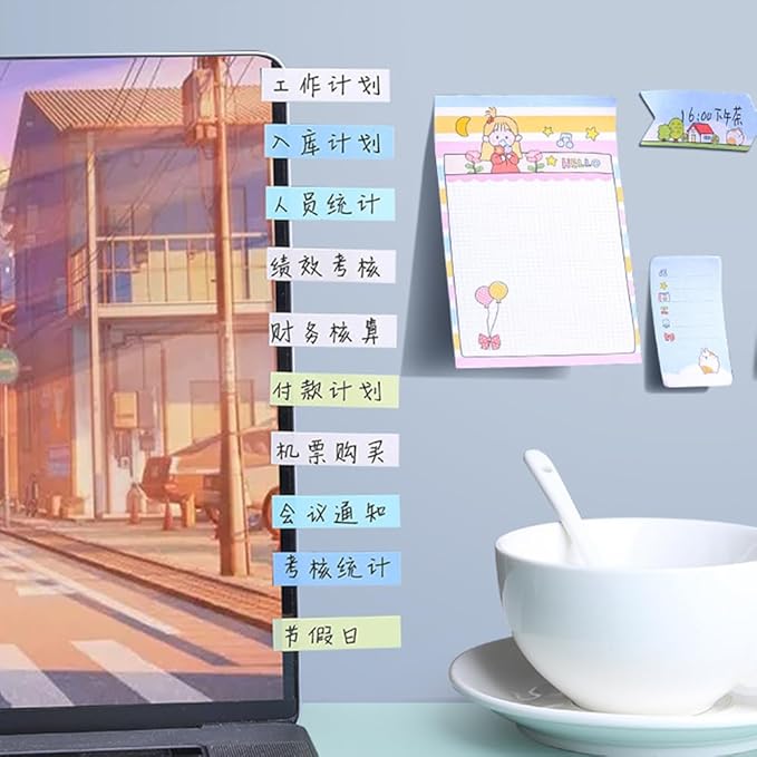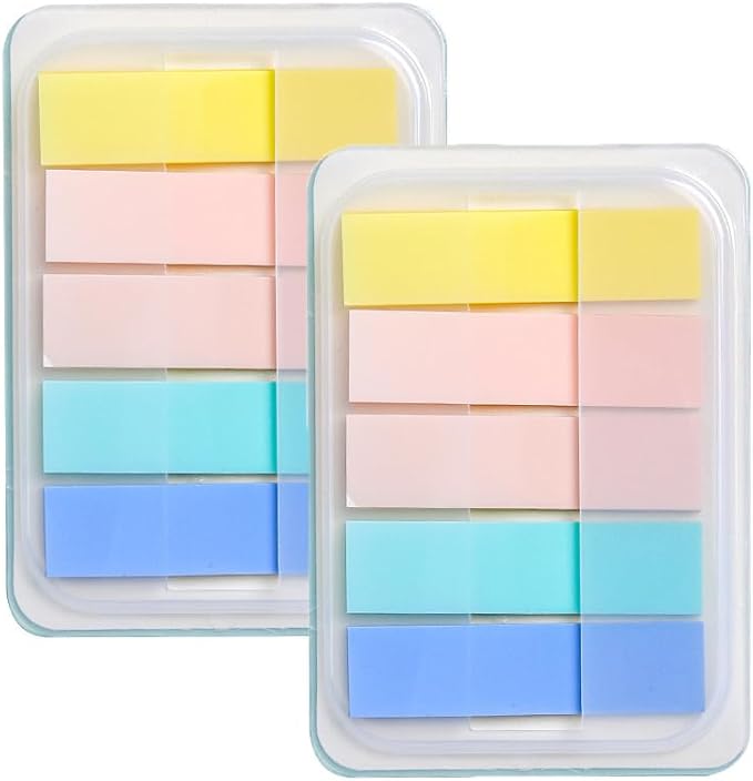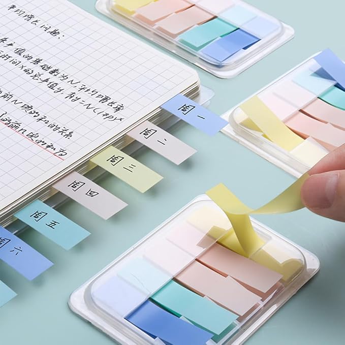 "サイズ:45 12mm カラー:カラフル 数量:5色各20枚 2部 素材:丈夫で破れにくい、フィルム素材の付箋。貼ると透明になるので、下の文字や絵を隠さず読める。 分類:カラフルな5色のセットなので、色で識別したり、書いた部分を目立たせたりすることができる。"