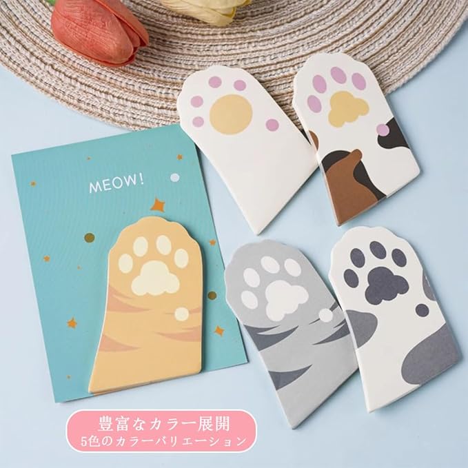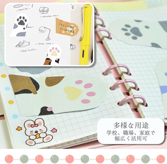 特徴 可愛い猫肉球デザイン、しおり付き、多彩なカラー、適度な粘着力