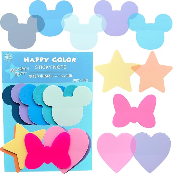 商品説明:透けて便利な半透明フィルム付箋のかわいい形とカラーの10色セットです。半透明だから、教科書や本を汚さずに書き込むときにも便利!くすみカラーとネオンカラー、形はネズミ型、リボン、ハート、星と夢いっぱいの可愛い形がそろったセットです!小さめサイズなので、メッセージやメモにもちょうどいい♪ インデックスや見出しにもちょうどいいサイズです。大きすぎないちょうどいいサイズなので筆箱にも入るサイズです☆1冊20枚つづり。合計200枚たっぷり使えます♬ プレゼントにも最適!使えて消えて、残らないプレゼントを渡したいときにもピッタリです♪食べ物と違って腐らないから、いつでも渡せる♪てってもおすすめです♪【