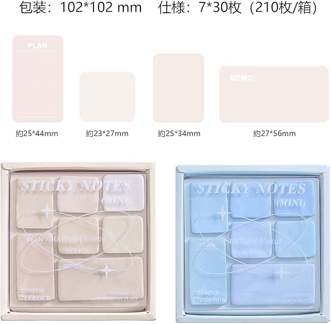 【パッケージ】可愛い付箋を2箱お届けします、色:ブルー、アプリコット。 箱のサイズは約102x102mmです。210枚のインデックス付箋の各箱には4つのサイズが含まれており、異なるニーズを満たすことができ、あなたの勉強や仕事をより便利にします。