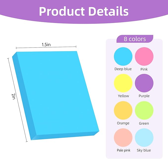 パッケージ内容:1.5 x 2インチのミニ粘着パッド、8色、各色3個、24個、パッド100枚、合計2400枚。