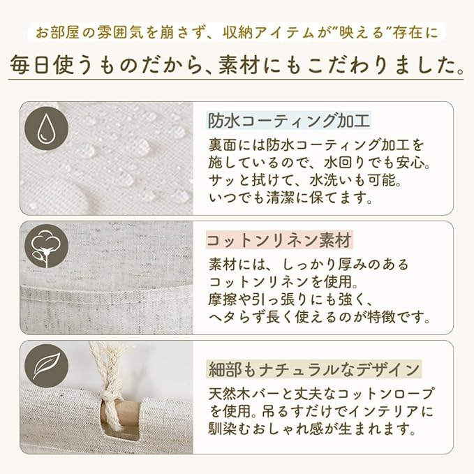 ✅【防水コーティング&丈夫な素材】裏面には防水加工を施し、水回りでも安心。素材は厚手のコットンリネンを使用しており、摩擦や引っ張りに強く、長く使えるのが魅力です。