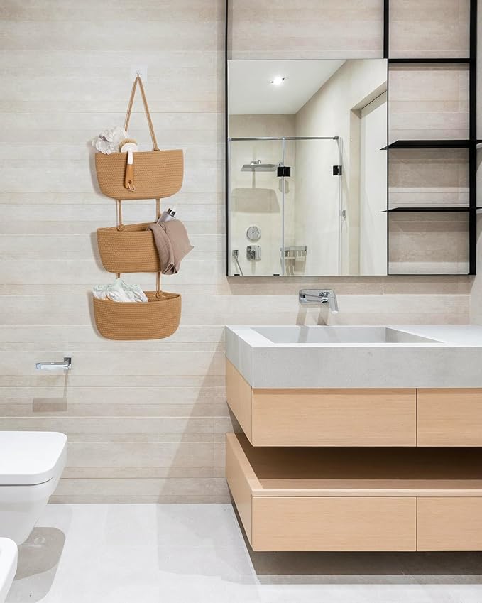 【通気性のある綿麻素材&洗える|温もりある手作りデザイン】手作業で編み込んだ高品質な綿麻素材を使用し、自然な風合いと通気性を兼備。洗面所 壁掛け 収納や脱衣所のタオル 収納にもぴったりで、軽い汚れは手洗いOK。優しいカーキ色がナチュラルインテリアにも調和します。