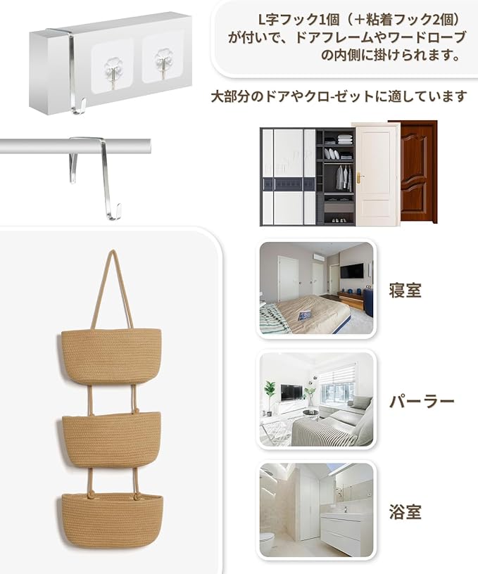 商品用途・使用方法 ドア裏収納, クローゼット収納, 洗面所収納, タオル・おもちゃ・小物収納, スペース節約収納, 壁面整理