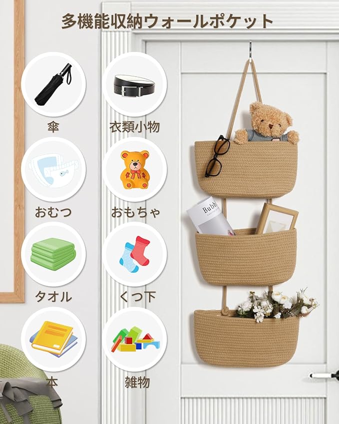 特徴 折りたたみ可能, ウォールポケット, 3段収納, 綿麻素材, 大容量, 隠す収納, 多用途, 省スペース, 壁掛け/ドア掛け対応