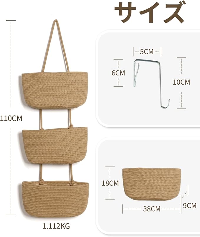 【製品仕様】: 収納袋サイズ:约18*38*9cm。壁掛けウォールポケットの全長サイズ(展開)は約110cm。素材:綿麻素材、フック鉄製。本体重量約1.12kg。使わない時も折りたたんでコンパクトに収納出来ます。