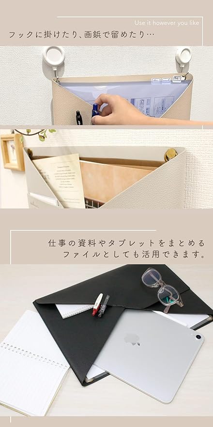✅【冷蔵庫・玄関ドアにも使える】背面に取り付け穴があるため、フック・ピン・強力マグネットフックなど多様な方法で設置可能。冷蔵庫に貼り付けて家族のお便り・献立メモをまとめたり、玄関ドアに掛けて郵便物や鍵・印鑑置きにしたり、在宅ワークのデスク横で資料整理に使ったりと活躍シーン多数。縦横どちらでも置けるため、壁に穴を開けられない賃貸でも気軽に使えるのがポイント。省スペース収納として特に評価が高く、家事動線の効率化にも貢献】