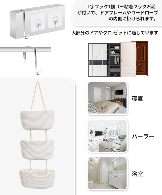 商品用途・使用方法 ドア裏収納, クローゼット収納, 洗面所収納, タオル・おもちゃ・小物収納, スペース節約収納, 壁面整理