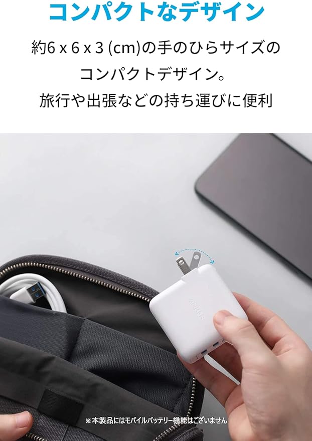 旅行に最適:折りたたみ式プラグおよびコンパクトサイズで持ち運びやすさを追求しました。また世界各国の電圧(AC 100-240V)に対応しているので海外旅行にも最適です。
