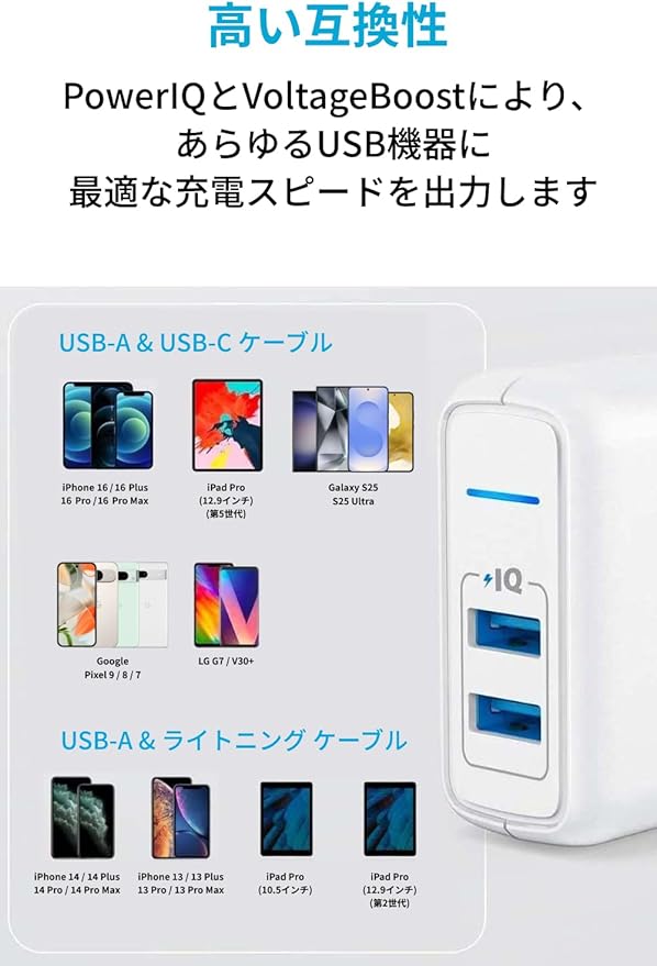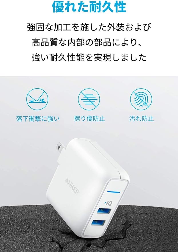 より速い充電を:Anker独自の充電技術であるPowerIQおよびVoltageBoostを搭載し、どのような機器に対しても各ポート最大2.4Aの最適な充電スピードを出力します(一般的な5W出力の充電器に比べ、急速充電となりますが、Power DeliveryやQuick Charge等の充電規格に対応してません)。