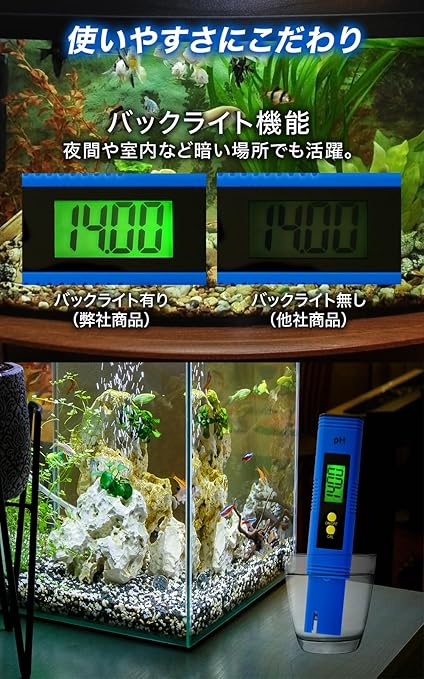 【様々な用途に】 アクアリウム、水槽管理、メダカの飼育管理、液肥の調整、飲料水、水道水、プール、事業用・研究用など様々な用途で活用できます。バックライト機能搭載で夜間や室内など暗い場所でも活躍します。また、小型で重さ50gと軽いため持ち運びやすく、本体裏側にクリップが付いているので収納に便利です。
