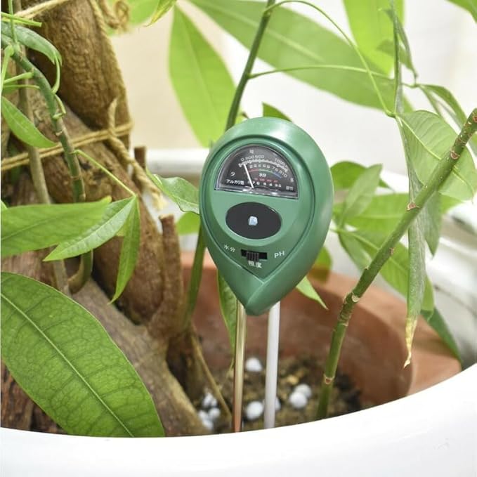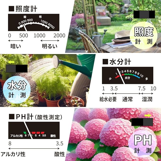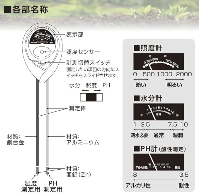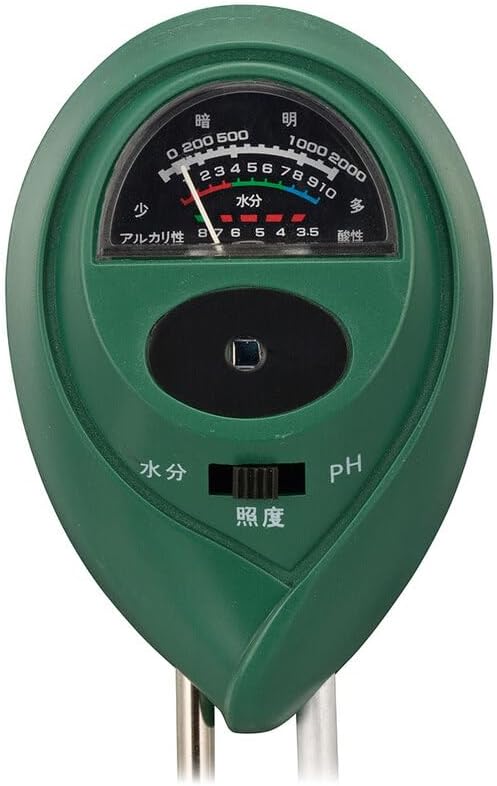【 特 長 】 ◆土壌にさすだけでその場所の「水分」「照度」「PH」の測定ができます ◆電池不要ですぐにご使用いただけます ◆設定や計算の必要がないので簡単に測定できます ◆花や野菜の生育管理に