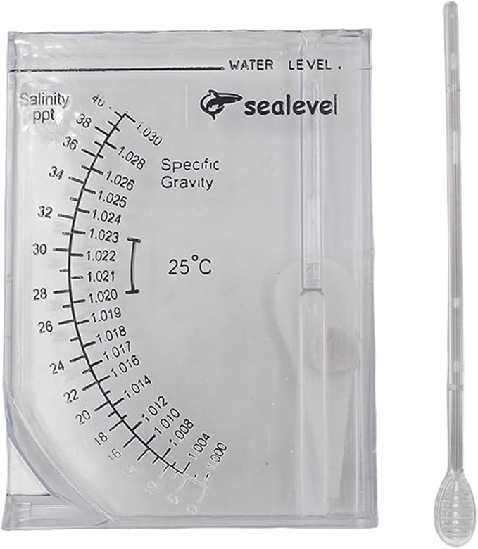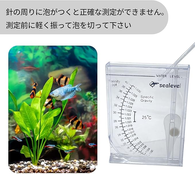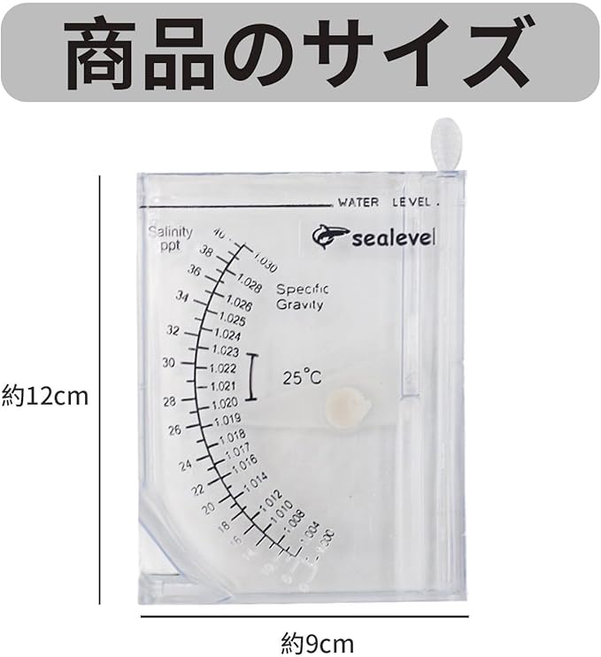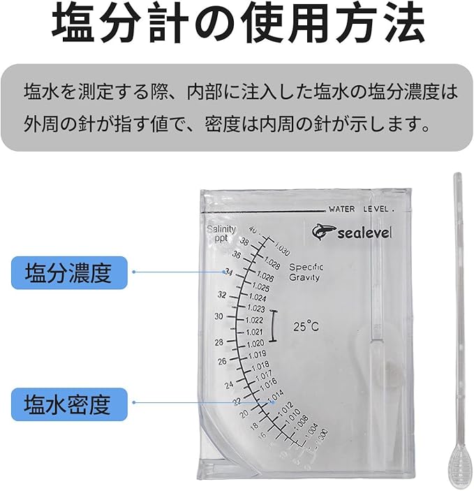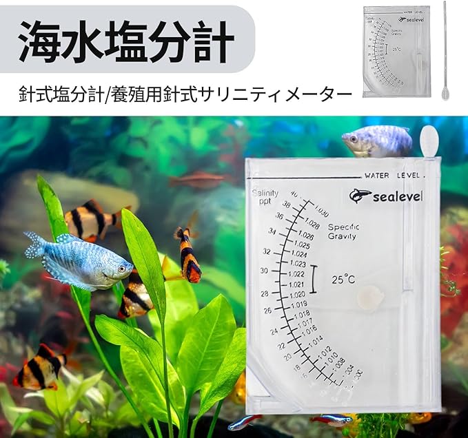 【仕様】1セットの水槽用塩分計(容器:約9x12x1.5cm、測定棒:約13.5cm)。推奨水温25℃(20℃-30℃対応)、温度変化で測定値変動あり。