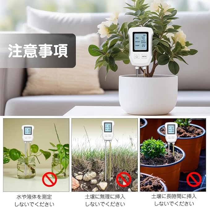 【使用方法】:本製品にはAAA電池3本が必要ですが、製品には付属しておらず、別売りですのでご了承ください。土壌のみ適用されますので、液体や砂など他のものには適用されないでください。測定時、土壌でプローブの約3分の2を挿入することで、より正確なデータを得ることができます。使用するたびにプローブに泥が付着していないことを確認してから、次の測定を開始してください。