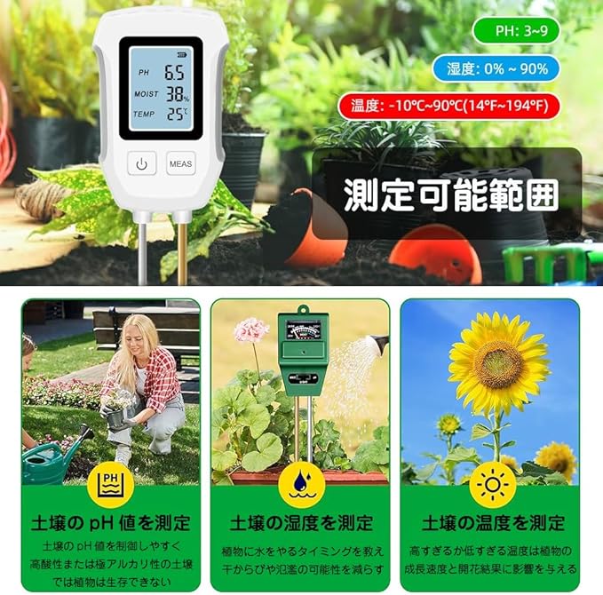 【3-in-1】:多機能で高精度な土壌メーターは、家庭菜園の手入れから農作物の栽培管理まで、花や植物のケアに幅広く活躍しています。1台でph値、湿度、温度をチェックできるので、とても簡単で使いやすいです。