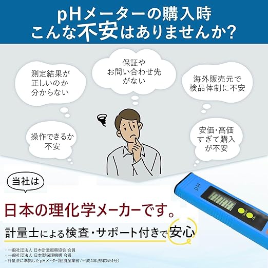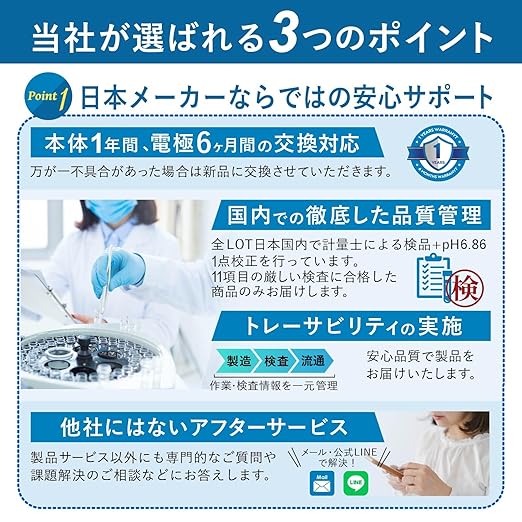 【国内向けに特化したpHメーター】年間数万台を出荷し、本体1年間と電極6ヶ月の製品保証が付いていますので、安心して長くお使いいただけます。