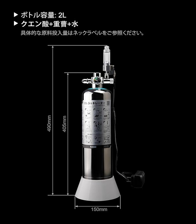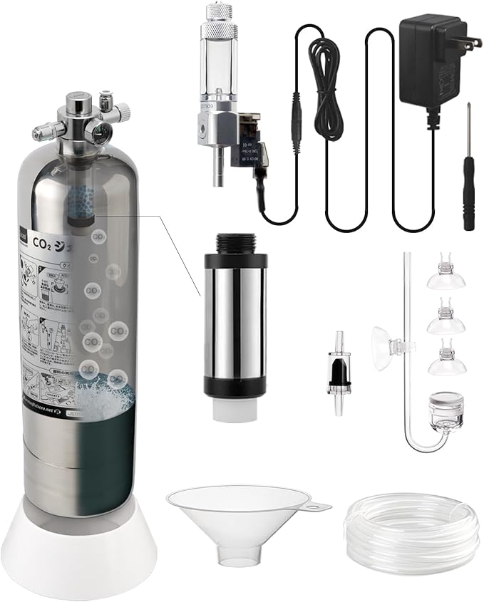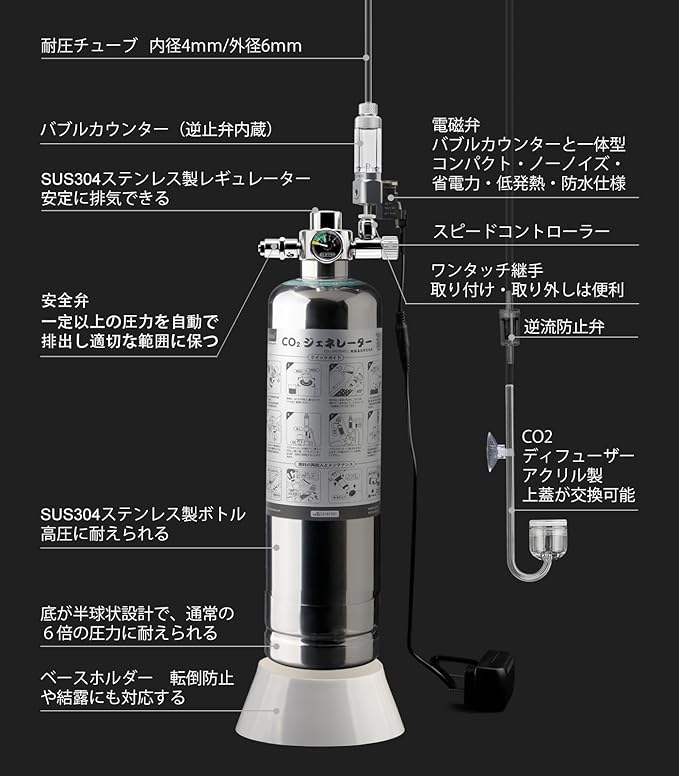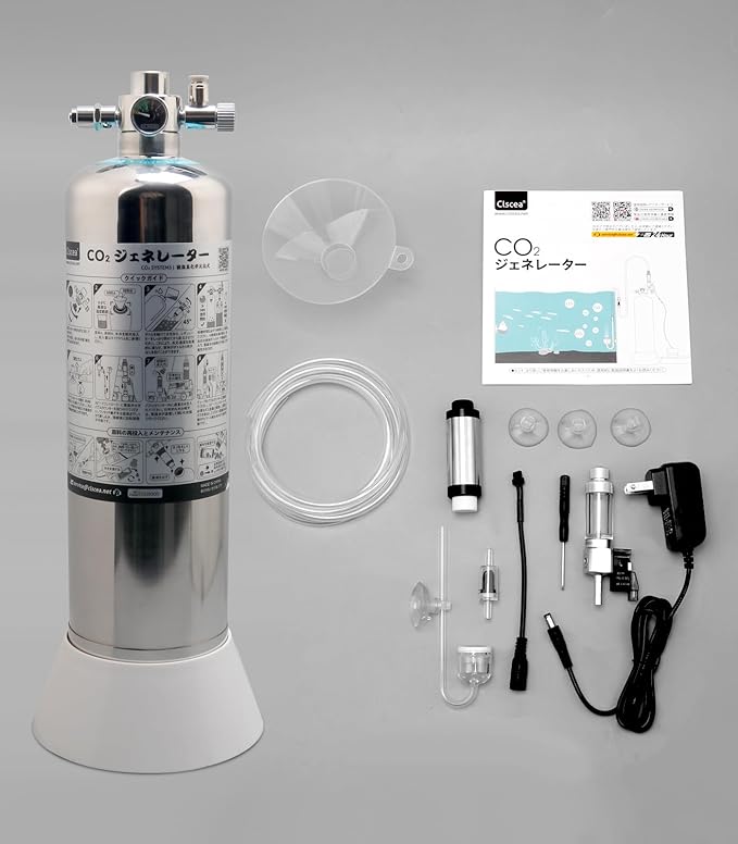優れたSUS304ステンレス鋼製CO2ジェネレーターキットです。操作が簡単で、初めての方からCO2添加の経験の長い方までご利用いただけます。2L容量で、小型水槽~90㎝水槽位までに適しています。スタイリッシュな外観で、無理に隠す必要はありません。