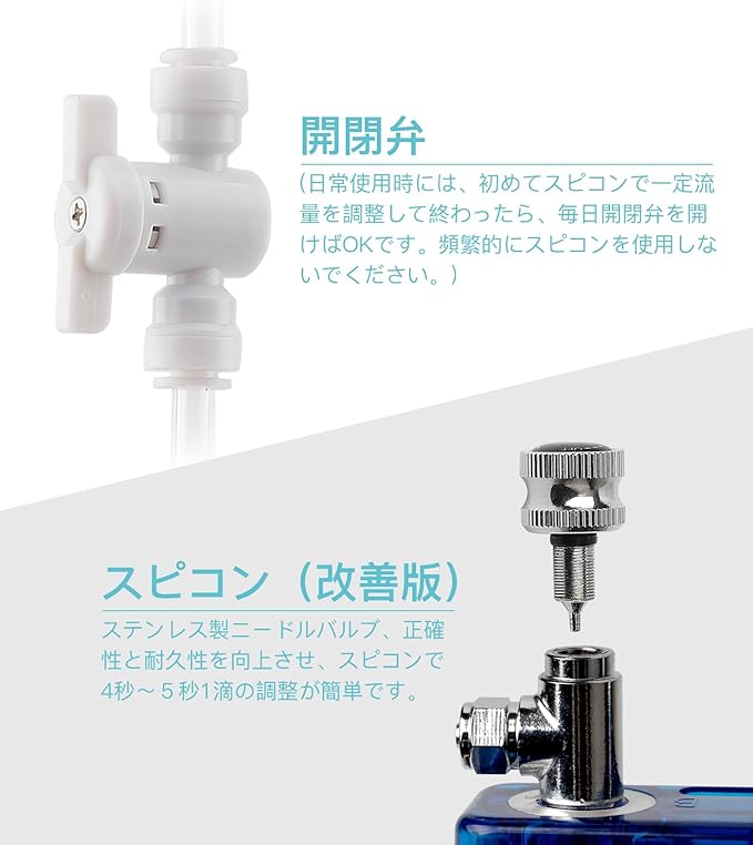 【付属品完備】:開閉弁について日常使用時には、初めてスピコンで一定流量を調整したら、毎日開閉弁を開けばOKです。頻繁的にスピコンを使用しないでください。スピコン(改善版):金属素材です。正確性と耐久性を向上させ、スピードコントローラーで4秒~5秒1滴の調整が簡単です。 1.6m耐圧CO2チューブ、日本語取扱説明書に付きます。