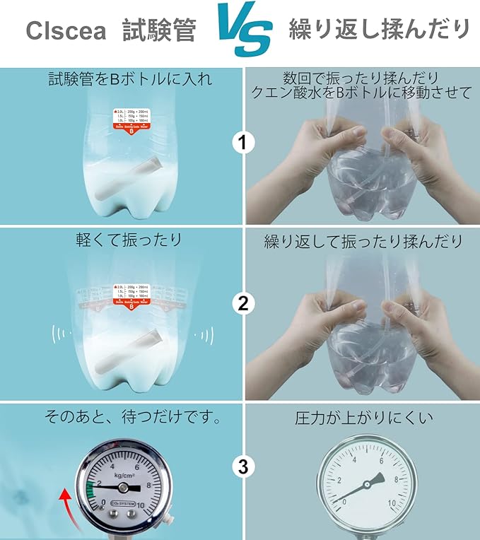 【Clscea圧力アップグッズ】:頻繁にボトルを揉む作業必要はありません。「グッズ」中にクエン酸を投入し、振って溶解すると、わずか 15 分で緑色の圧力範囲に達します。