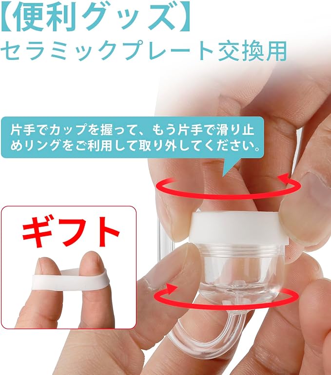 おまけ付きの滑り止めリングが、清掃、プレートの交換時には、これをご利用して拡散プレートをキャップにかけて、ディフューザーのカップに握って取り外せます(ディフューザーの付け根を無理に折らないでください)。ご購入後のご不明点等がございましたら、ご遠慮なくお問い合わせください。