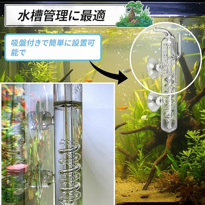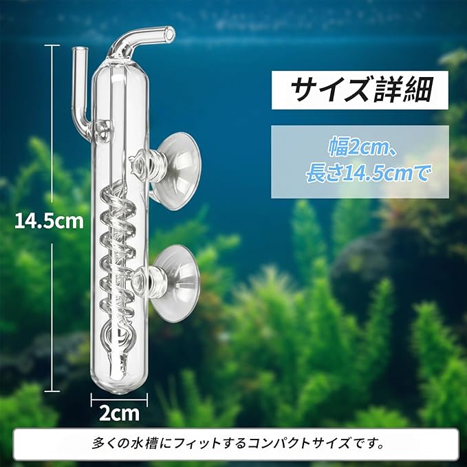 【セット内容】CO2カウンター1個と吸盤2個がセットになっており、すぐに水槽に取り付けられます。 【サイズ詳細】幅2cm、長さ14.5cmで、多くの水槽にフィットするコンパクトサイズです。 【クリアガラス製】高透明ガラスで螺旋状に上がる気泡が美しく観察できます。 【CO2量の確認が簡単】気泡の動きを見ながら水槽内のCO2添加量を簡単にチェックできます。 【水槽管理に最適】水草や魚の飼育に便利な計測器で、吸盤付きで簡単に設置可能です。