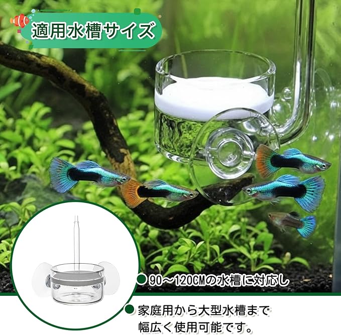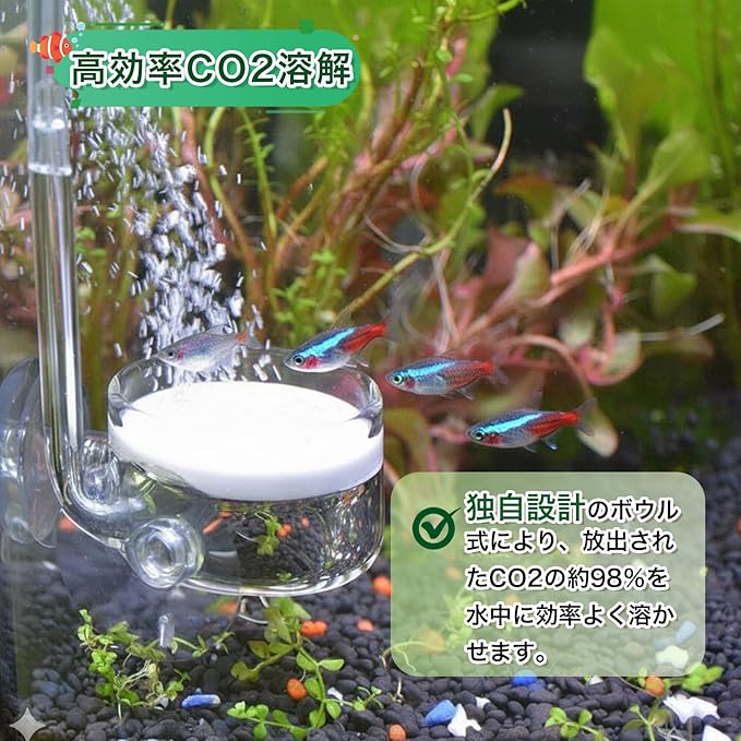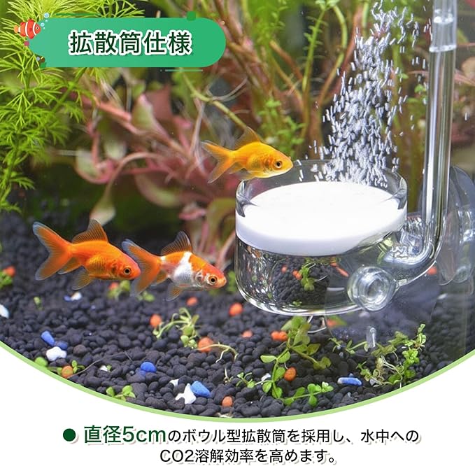 【適用水槽サイズ】90〜120cmの水槽に対応し、家庭用から大型水槽まで幅広く使用可能です。 【拡散筒仕様】直径5cmのボウル型拡散筒を採用し、水中へのCO2溶解効率を高めます。 【チューブ対応】4/6mmのCO2チューブに対応しており、簡単に接続できます。 【高効率CO2溶解】独自設計のボウル式により、放出されたCO2の約98%を水中に効率よく溶かせます。 【水槽全体への拡散】本品を設置するだけで、飼育水全体に均一にCO2を拡散し、水草の成長をサポートします。