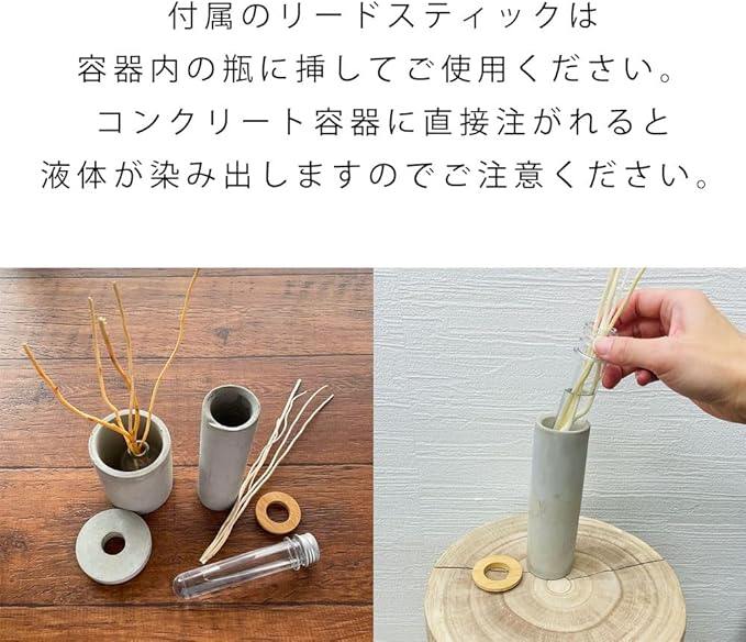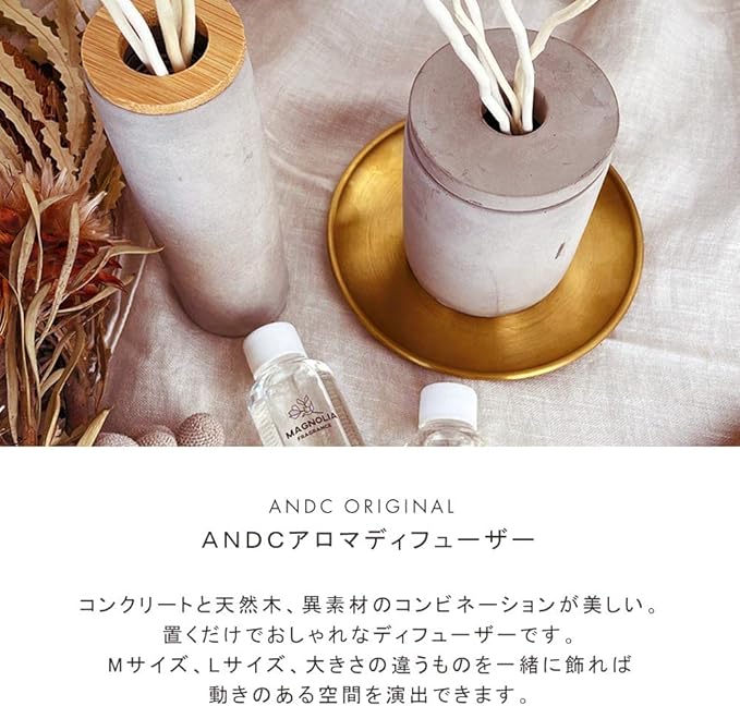 ANDCアロマディフューザー コンクリートと天然木、異素材のコンビネーションが美しい 洗練されたインテリアにぴったりの、置くだけでおしゃれなディフューザーです Mサイズ、Lサイズ、大きさの違うものを一緒に飾れば動きのある空間を演出できます。 感性をくすぐる上質なデザイン。本体容器は生活の様々なシーンにお使いいただけます。 <上品でどんな空間にもなじむ癒しの香り> マグノリア 甘く爽やかで、ふんわりとした無垢な香り すずらん 生花のようなみずみずしく透明感のある香り ムスク 落ち着いた深みと清潔感のある、上品なサボンの香り ウッディ 大自然のような、すっきり深い森林の香り サボン 上品で清潔感あふれる、せっけん調の香り サイズ ●Mサイズ 細長くて背の高い方 φ4.5cm/縦28cm(スティック:27cm3本25cm2本) ●Lサイズ 幅がある背の低い方 φ7.5cm/縦26cm(スティック:25cm3本22cm2本) ●お部屋の環境により異なりますが、おおよそ春夏は2.5ヶ月、秋冬は3ヶ月程度香りが持続いたします。 ●内容量はM/Lサイズともに同じ50mlです。 ●付属のリードスティックは容器内の瓶に挿してご使用ください。コンクリート容器に直接注がれると液体が染み出しますのでご注意ください。