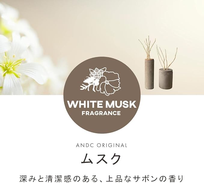 AndC リードディフューザー 約2.5ヶ月 ホワイトムスク スティック 容器 アロマディフューザー 花 ボトル おしゃれ ラタンスティック 北欧 インテリア (ムスク, 本体:Lサイズ)
