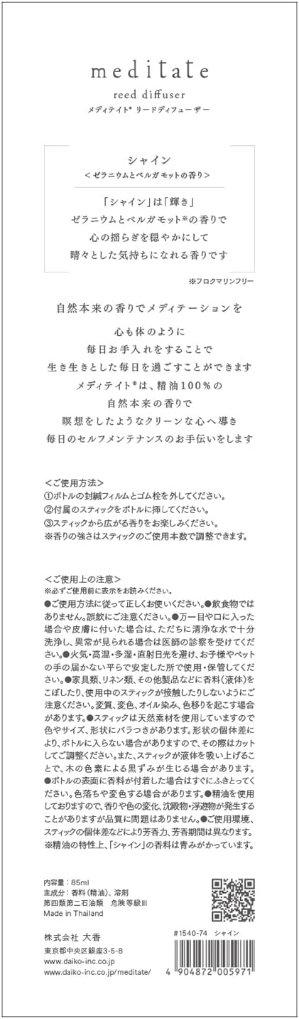 meditate(メディテイト)リードディフューザーシャイン(ゼラニウム ベルガモットの香り)85ml 精油