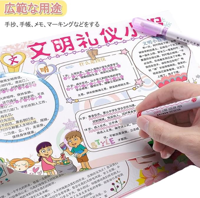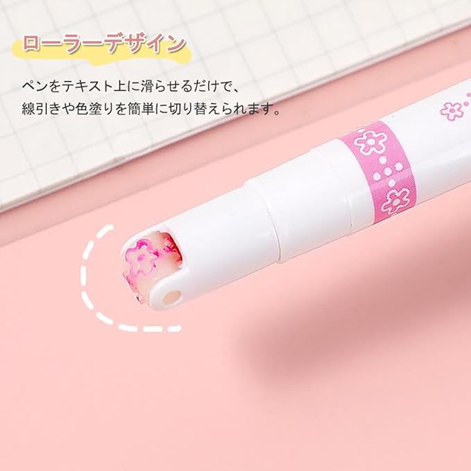 デュアルチップ設計:1本の蛍光ペンで2つの筆記方法が可能。8色、6種類のクリーンライン。線引きや色塗りを簡単に切り替えられます。