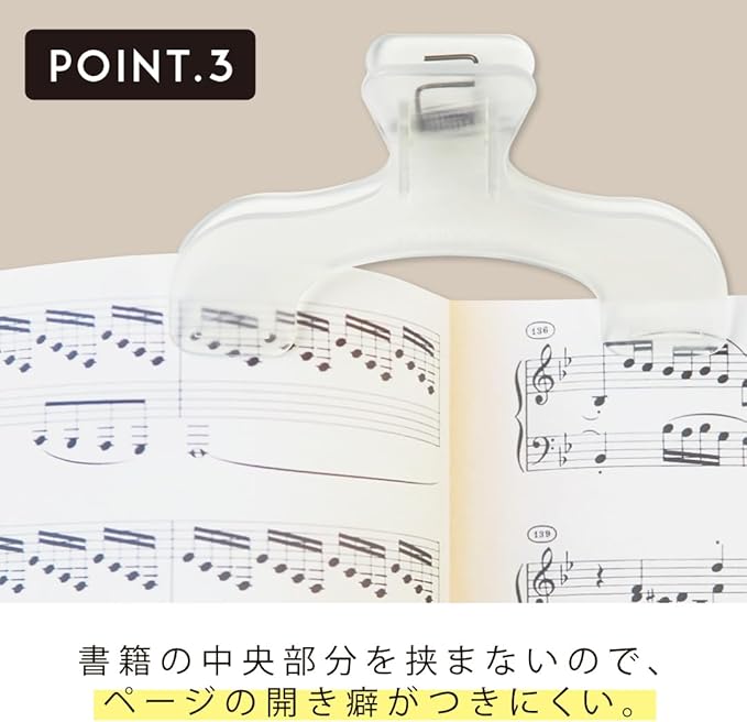 ①2か所で真ん中を隠さず留めるので、書籍の内容が見やすい。 ②背表紙を避けて留めるので、厚めの教科書や参考書も留められる。 ③書籍の中央部分を挟まないので、ページの開き癖がつきにくい。 ④軽い力でガバっと大きく開く。 ノートに、地図に、手帳に、レシピに…etc