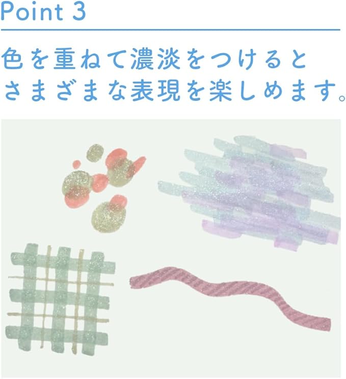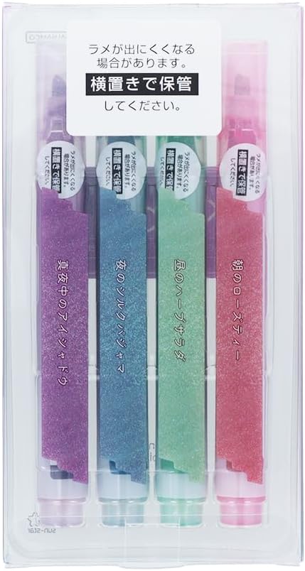 引いた線が輝く、ラメ入りインクが美しいマーカーです。大人っぽいニュアンスカラーが普段使いにぴったり。重ね塗りで濃淡をつけられるので、使い方次第でさまざまな表現を楽しめます。手帳やノートをお洒落に彩る、使うたびに気分がきらめくアイテムです。