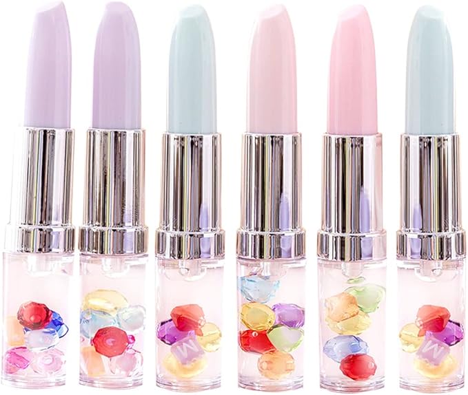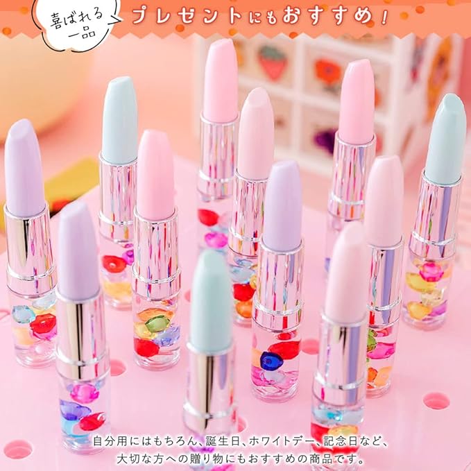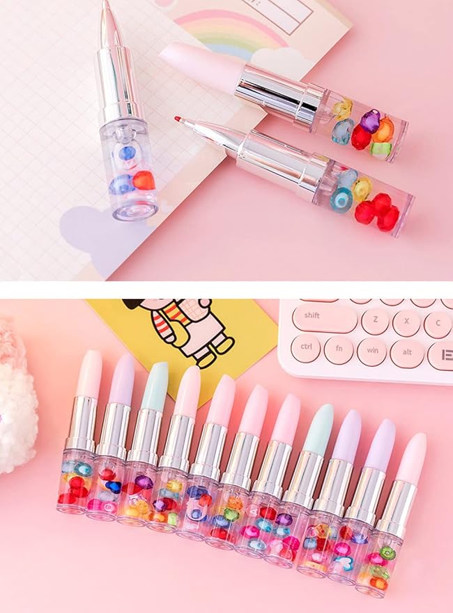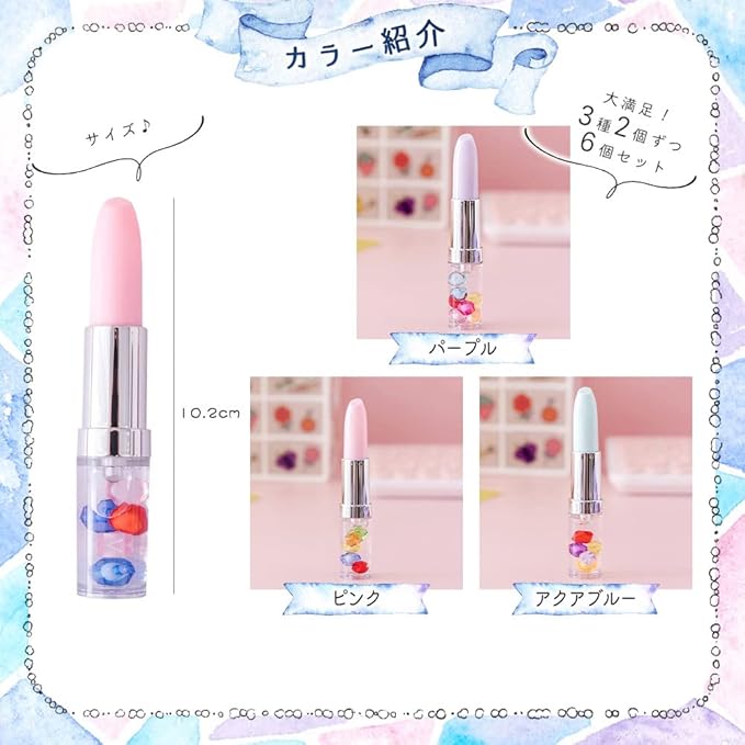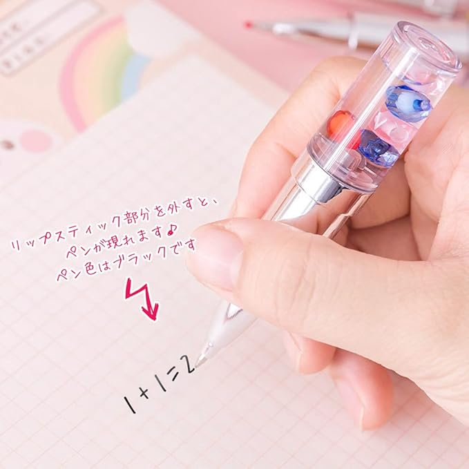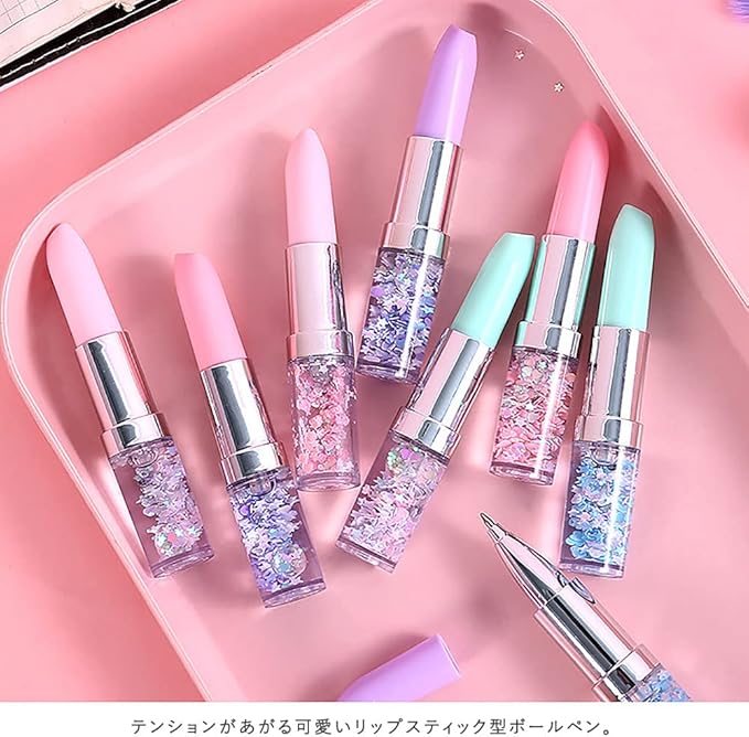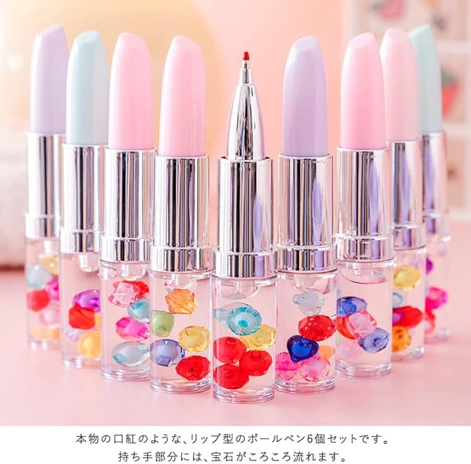 本物の口紅のような、リップ型のボールペン6個セットです。持ち手部分には、宝石がころころ流れます。ペン色はブラックです。