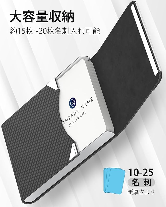 薄型・コンパクト設計:名刺約15〜25枚、カード約4〜8枚収納可能(厚みにより異なります)。スーツの内ポケットやバッグにもすっきり収まるスリム設計です。