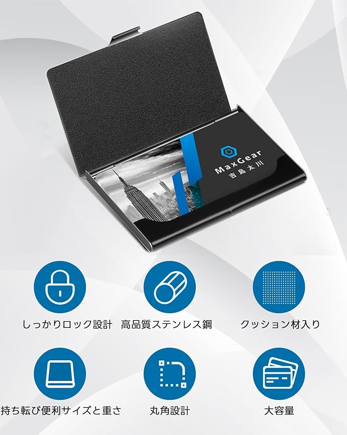 指紋防止技術:高級感溢れるステンレス製で、表面は滑らかで傷が付きにくく、ナノメッキ技術により指紋汚れが付きにくいのが特徴。薄型で軽量なデザインは、一般的な名刺入れよりも強度があり、耐久性にも優れています。