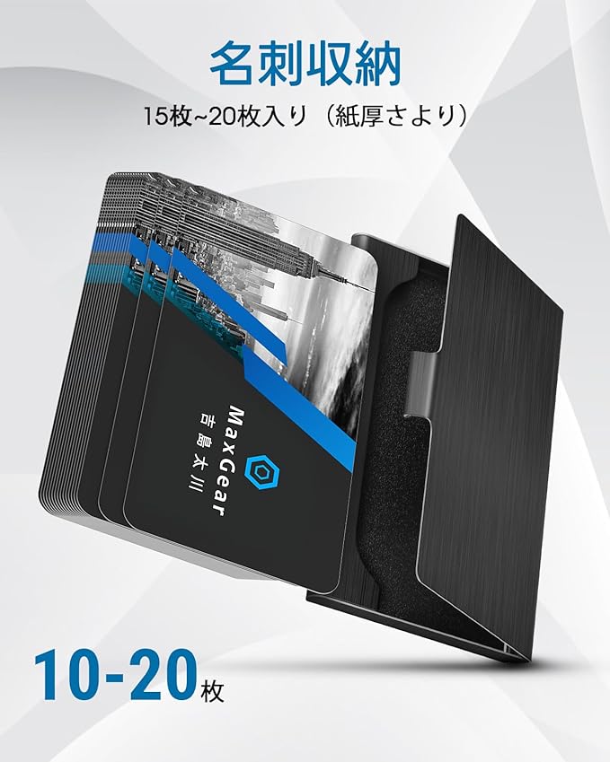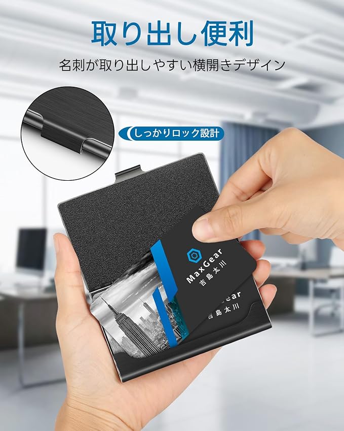 ビジネスシーンに最適:シンプルで洗練されたデザインは、ビジネスマンにぴったり。取引先や同僚に良い印象を与え、MaxGearのバックル式名刺ホルダーは名刺の取り出しがスムーズで、仕事の中で大いに役立ちます。