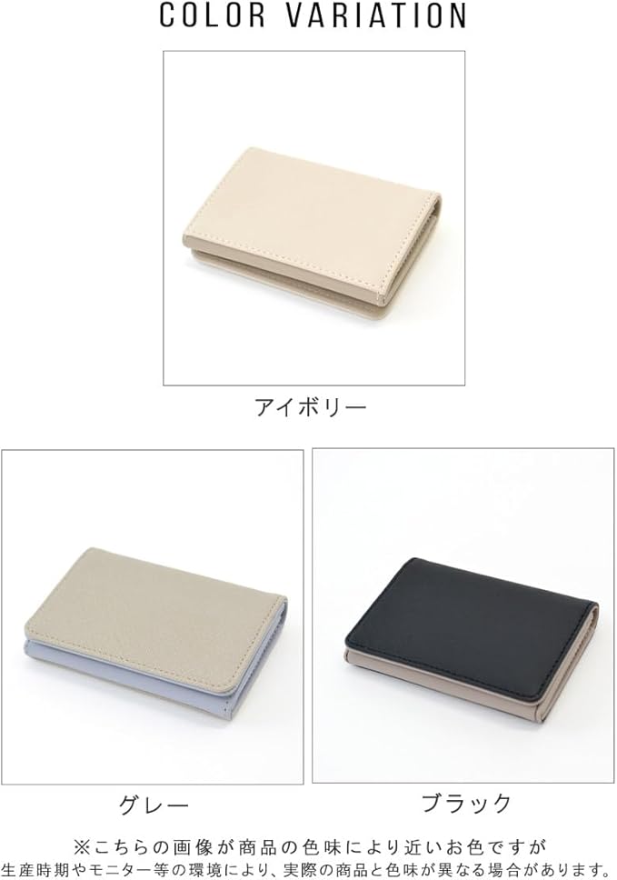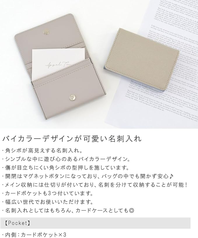 ・角シボが高見えする名刺入れ。・シンプルな中に遊び心のあるバイカラーデザイン。・傷が目立ちにくい角シボの型押しを施しています。・開閉はマグネットボタンになっており、バッグの中でも開かず安心♪・メイン収納には仕切りが付いており、名刺を分けて収納することが可能!・カードポケットも3つ付いています。