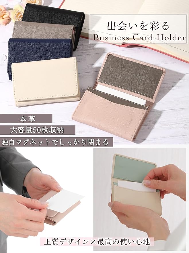 【納得の大容量】名刺は最大50枚程度収納が可能です。内部にはポケットが2つ、名刺入れ背面にもポケットを設けることでいただいた名刺の一時保管や、お渡しする名刺の準備、その他カードなどを分けて収納できます。また、型崩れしにくいレザーのため、多く収納しても膨らんだり型崩れしにくくいつもスマートにお使いいただけます。