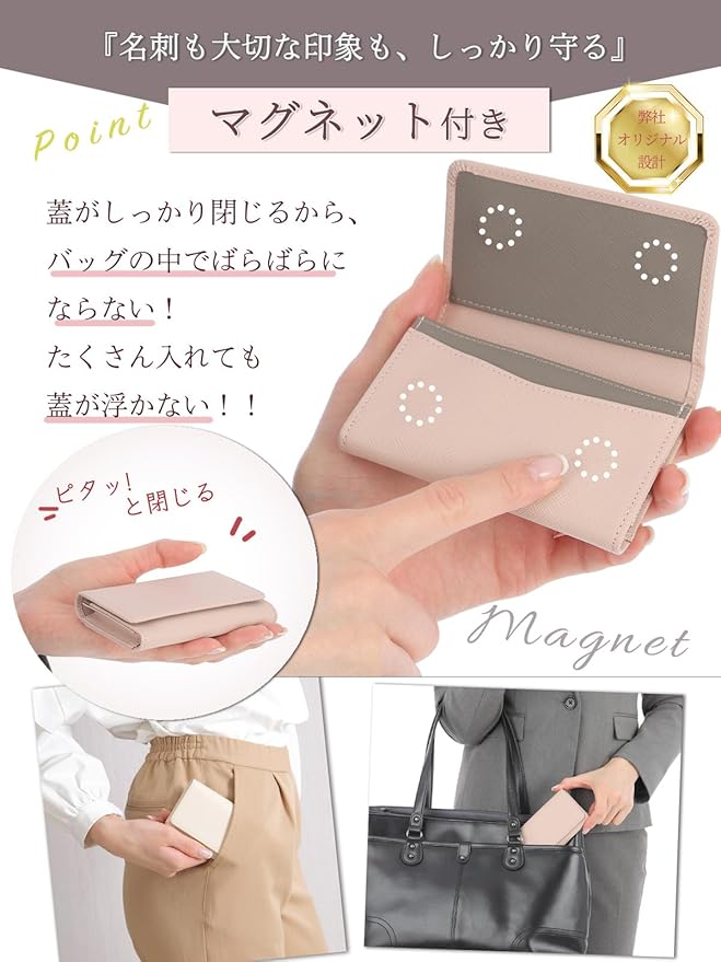 【しっかり閉じるマグネット付き】蓋内部には独自のマグネットを内蔵し、バッグの中やポケットの中で中の名刺がこぼれてぐちゃぐちゃにならない仕様になっています。マグネットの強度は強すぎず弱すぎず、ちょうど良い強度にこだわって設計しました。名刺をたくさんいれても蓋が浮くのを防ぎます。