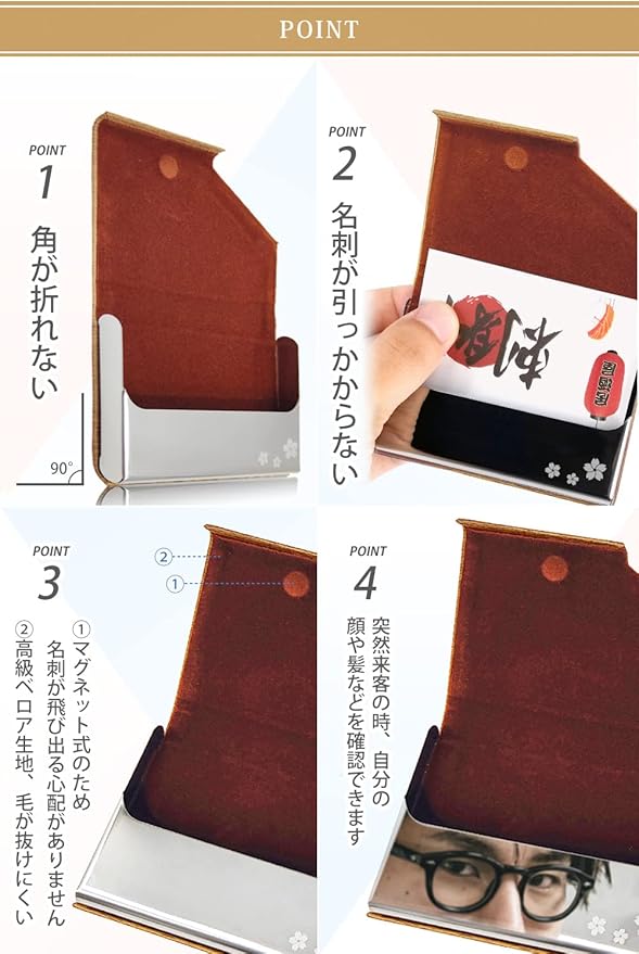 【折れる防止】名刺入れの内側は耐久性抜群のステンレス製、名刺が折れず・汚れずキレイな状態で保管できます。