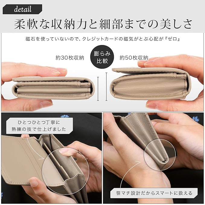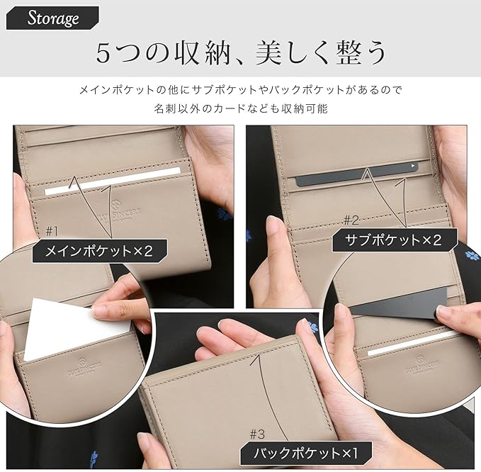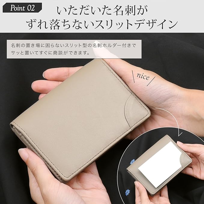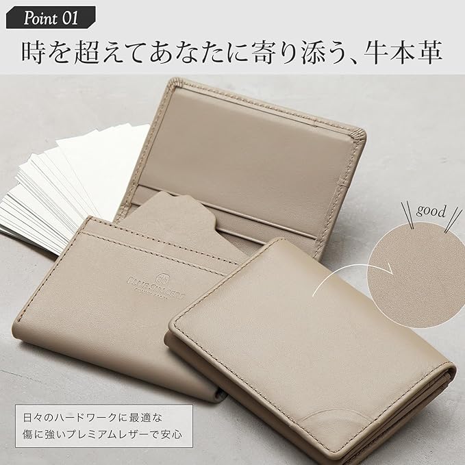 【こだわりの素材と機能性】BLUE SINCEREオリジナルで開発した上質なプレミアムレザーを使用し、しっとりと手に馴染む質感と高級感ある風合いを実現しました。見た目の美しさだけでなく、使い込むほど手に馴染む本革ならではの魅力をお楽しみいただけます。コンパクトなサイズ感ながら、名刺を40枚以上収納可能な大容量設計。日常使いはもちろん、ビジネスシーンでもスマートに活躍する、機能性とデザイン性を兼ね備えたアイテムです。