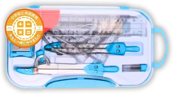 コンパス・分度器・直角二等辺三角定規・直角三角定規・15cm定規のさんすうセット。スリムで開けやすいケース付き。