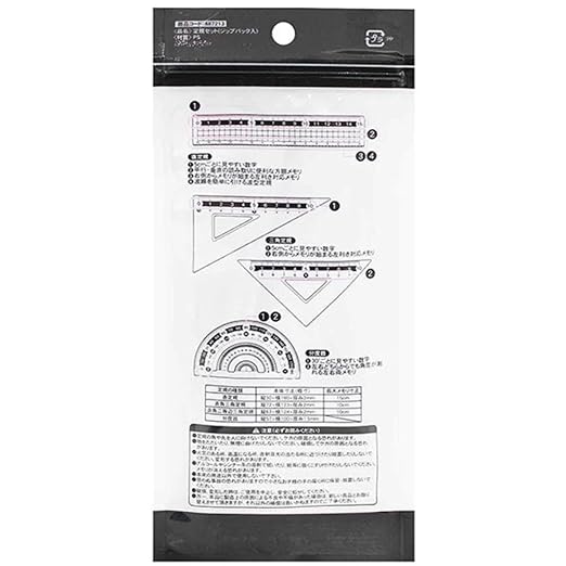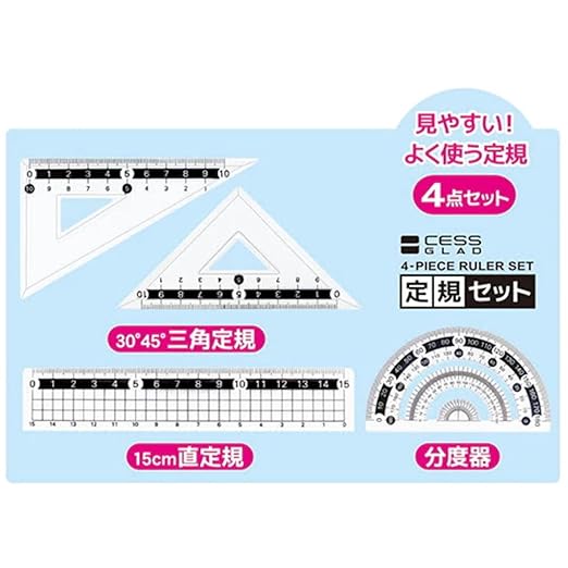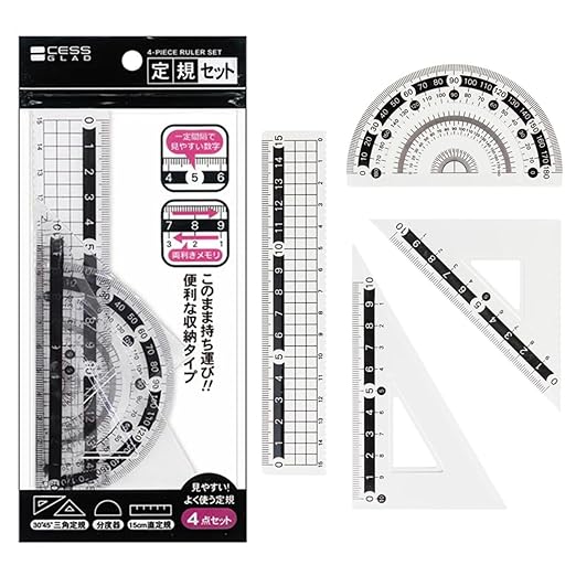 ✅直定規(最大メモリ15㎝)、直角三角定規(最大メモリ10cm)、直角二等辺三角定規(最大メモリ10cm)、分度器の4点セットとなります。