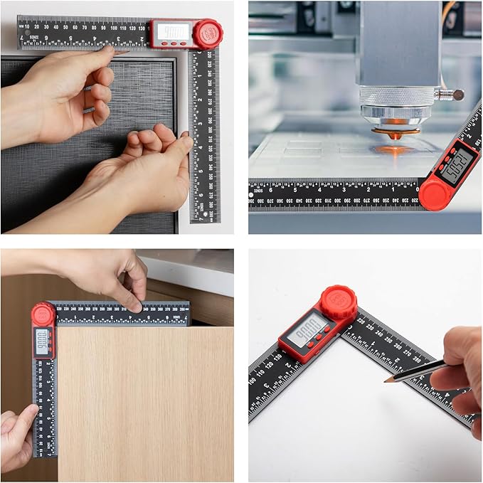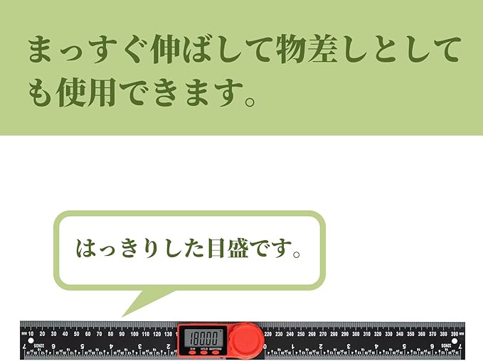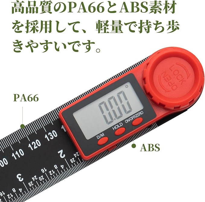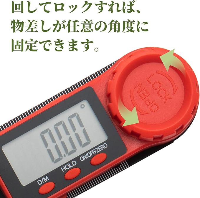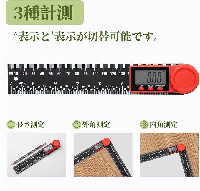 [3種計測] 本製品は、外角測定機能、内角測定機能、長さ測定機能を備えたデジタル角度ゲージです。外角/内角/長さを測定できます。[測定範囲] 角度:0~360 、長さ:0~200mm、精度:0.01 mm。高精度で、毎日のご使用に最適な測定ツールになります。スライド部の動きは軽いです。回してロックすれば、物差しが任意の角度に固定できます。測量対象の長さと角度を同時に測定できます。