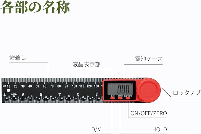 [ 表示と′表示切替可能]「D/M」ボタンを押すと、 / ′の二つ測定単位を換算できるので、簡単で正確に読み取られます。