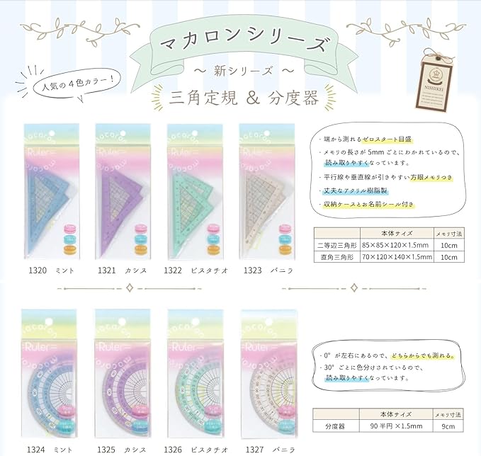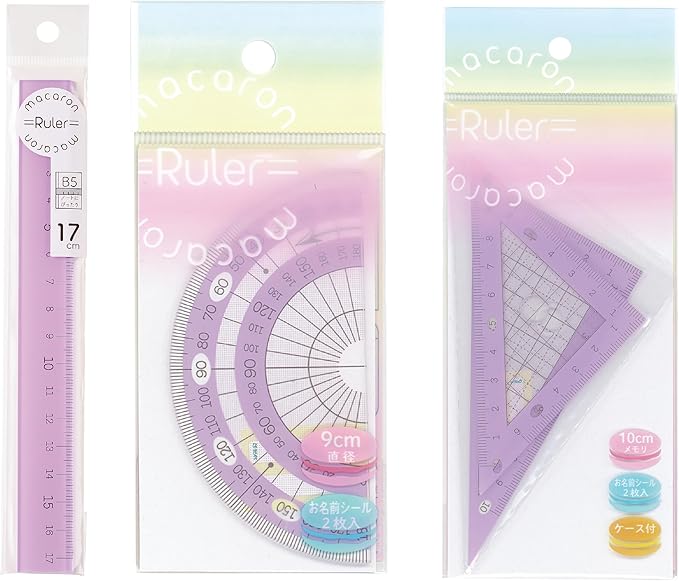 マカロンカラーの定規、三角定規、分度器のセット商品。
