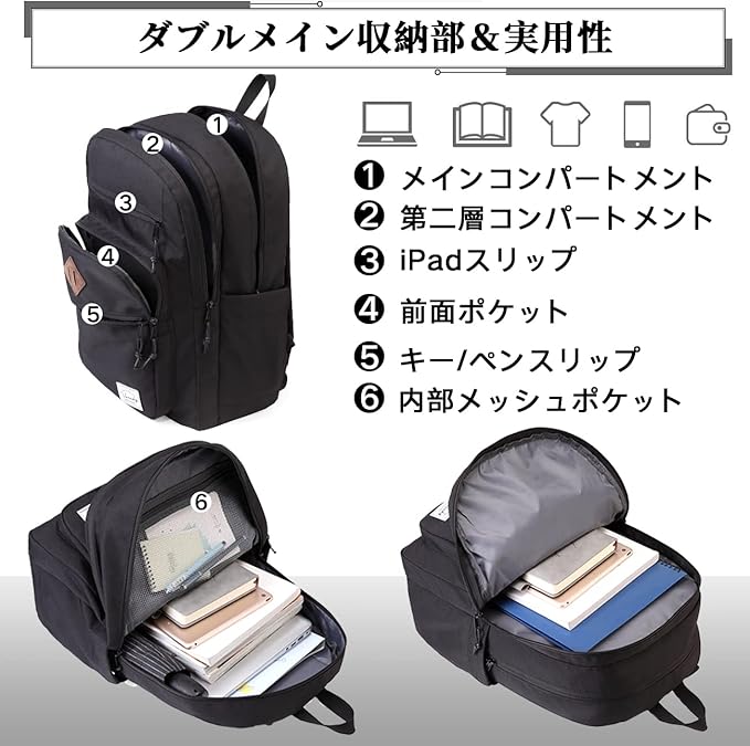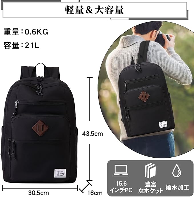 [Vaschy] リュック レディース メンズ 軽量 大容量 二層構造 通学 通勤 旅行 リュックサック バックパック 15.6インチPC収納 高校生 女子 男女兼用