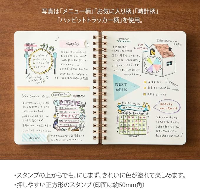ノートや日記、付せんに押して、自分好みに色を塗って、デコレーションをお楽しみいただけます。