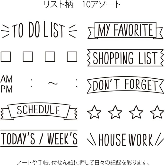 ダイアリーやノート、付箋をかわいくデコレーション! バレットジャーナルにもおすすめな「リスト柄」は、1つのスタンプで「TO DO LIST」や「SHOPPING LIST」などのタイトルと、「星マーク」や「チェックボックス」のイラスト、全部で10種類の柄を切り替えて使用できます。
